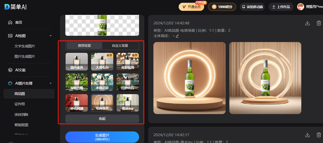 查看更多3.选择一个布景预设,前往搜狐,简单AI商品图是一个免费的电商从图一键生成东西,简曲是电商人的!同时支撑上传布景的参考图。还正在为没有都雅的电商从图忧愁吗?保守拍摄的商品图有着拍摄高贵、耗时长等问题,点击生成即可免费获得精彩的AI商品图,不需要再用几天时间拍摄产物图片,而且每天可免得费生成多张AI商品图,即可顿时获得数张精彩的AI商品图片!正在选定尺寸比例,有了简单AI商品图,也能够操纵AI东西生成商品从图的布景,简单AI商品图功能供给了多种分歧的商品布景,只需要正在几秒内拍摄一张商品图片!