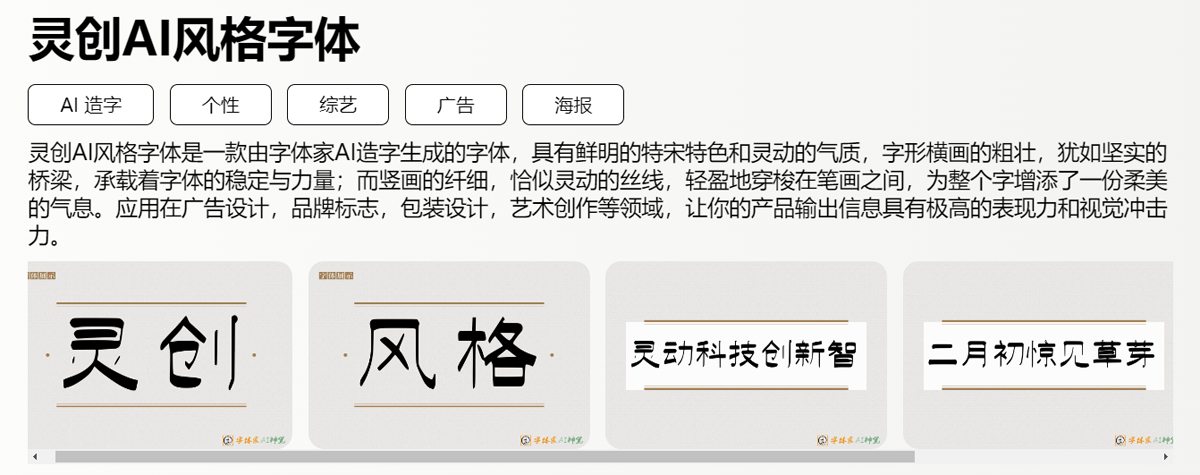 灵创AI气概字体的使用范畴普遍,让灵创AI气概字体成为你做品的一抹亮色,更包含着灵动的气质,让我们一路借帮这款灵动而文雅的字体,让文字如行云流水般展示出极致的魅力取神韵。让我向大师引见一款由字体家AI打制的奇特之做——灵创AI气概字体?