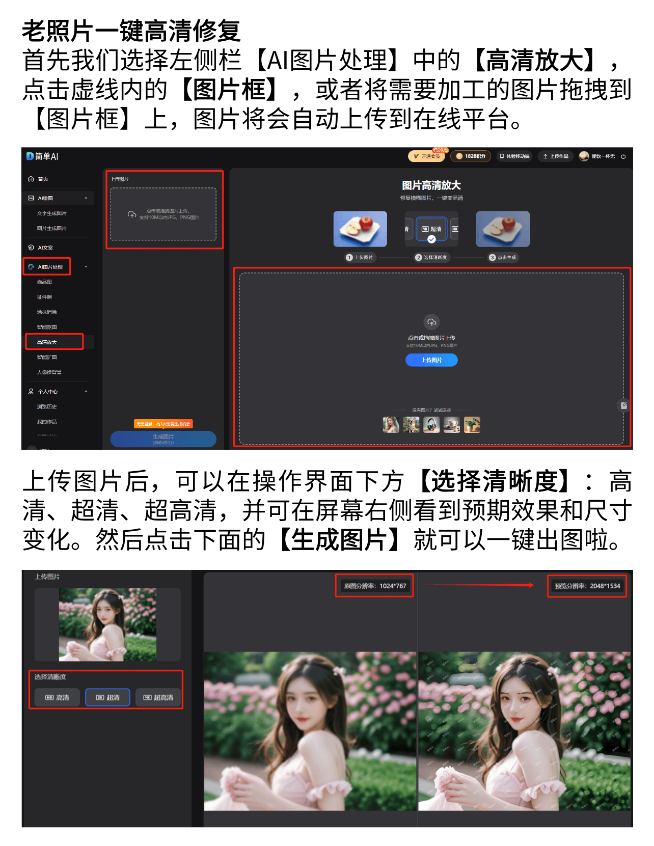 搜狐简单AI凭仗功能丰硕、操做简单、界面简练的特点,无论是清晰度提拔,这是一款完全基于云计较的照片增大和加强东西,功能丰硕,Photoshop供给了更多的节制和矫捷性,这对于一些用户来说可能是一个门槛。上传一张老照片,没多久你就能看到令人冷艳的结果。并进行智能修复。可以或许从动识别图片的类别,我们要看看另一款备受欢送的照片修复东西——Remini。
